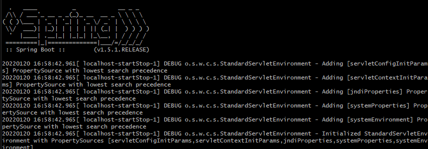 이렇게 하면 로그가 기록되는 화면으로 변환된다. cli창을 하나 더 열어서 이전의 방법으로 톰캣을 구동하거나 정지시키면 아래와 같은 로그가 나타나는 것을 볼 수 있을 것이다. (이 애플리케이션을 스프링 프레임워크를 사용해 만든 것이므로 spring 로고가 나타난다)