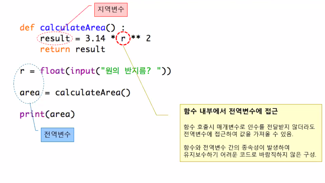 그러나 global을 사용해서 전역변수에 접근하는 것은 전역변수와 함수 간에 종속성을 발생시키므로 사용을 지양하는 것이 좋다.