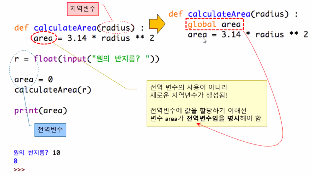 지역과 전역변수가 같은 이름을 갖는 것은 가능하다. 전역변수 접근은 어디서든 가능하다. 그런데 함수 안에서 전역변수의 값을 바꾸러면 global 키워드를 사용해서 그것이 전역변수를 의미함을 명시해 줄 필요가 있다.