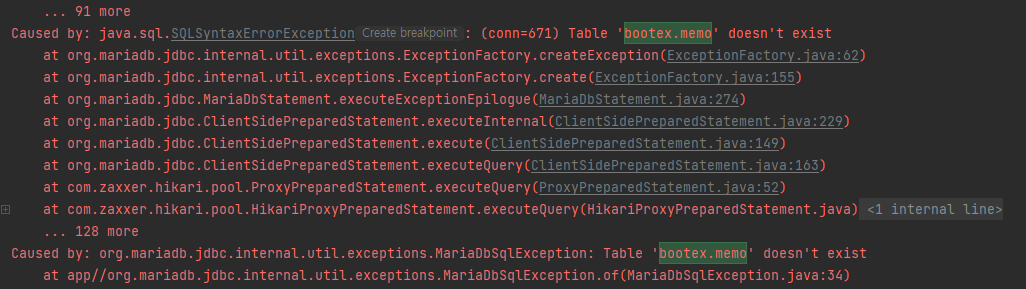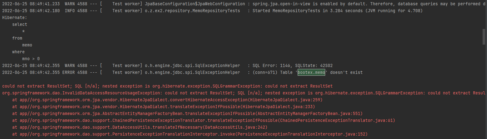 2022-06-25 08:24:36.090 ERROR 16600 --- [ Test worker] o.h.engine.jdbc.spi.SqlExceptionHelper : (conn=629) Table 'bootex.memo' doesn't exist