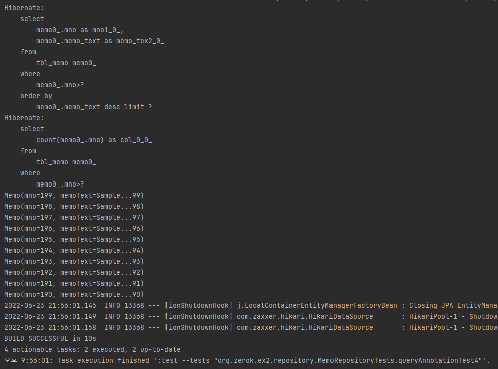 List<Memo> list = memoRepository.findByMnoBetweenOrderByMnoDesc(70L, 80L);