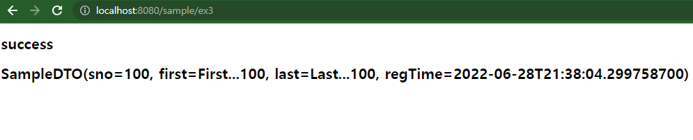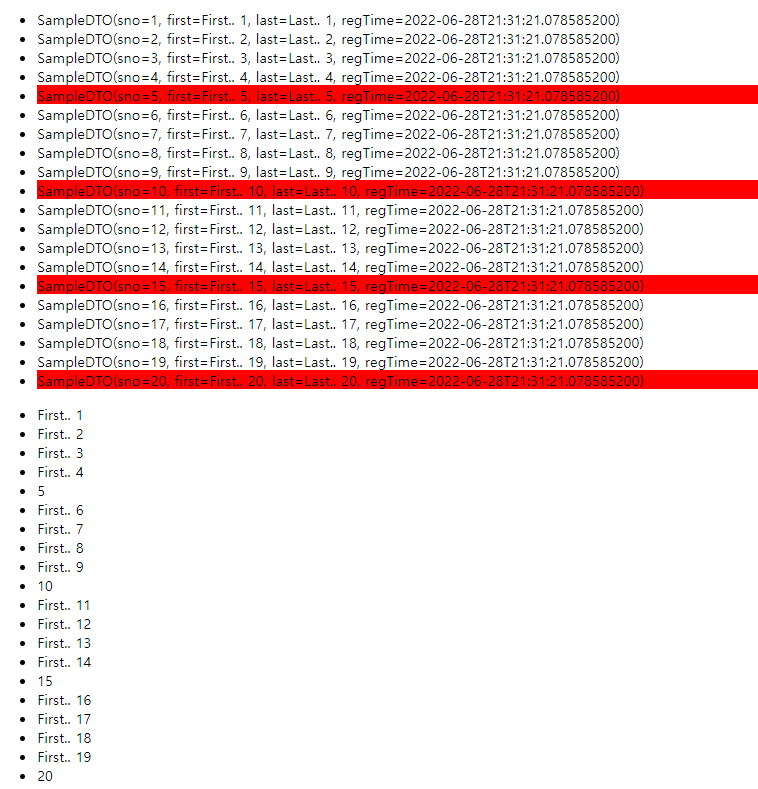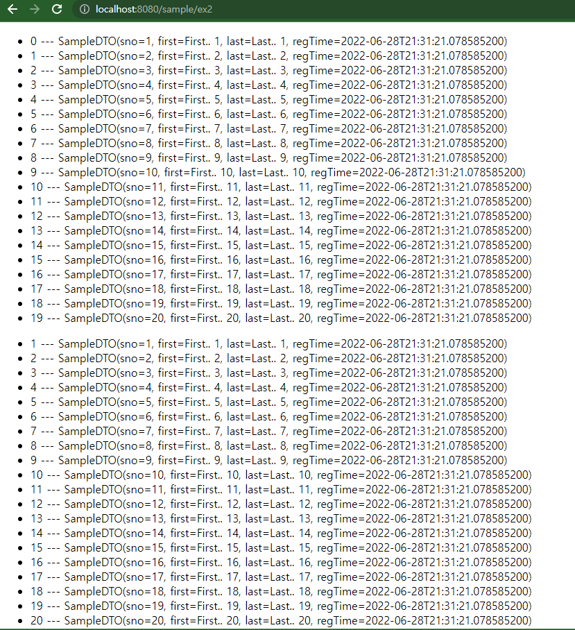 * SampleDTO 타입의 객체를 20개 추가하고 이를 Model에 담아서 전송