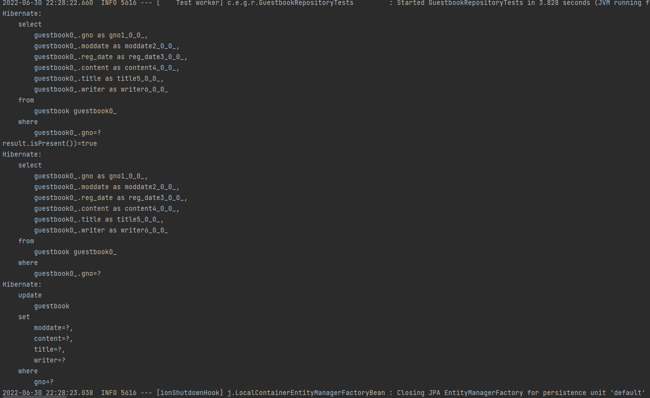 Guestbook클래스가 상속하는 클래스인 BaseEntity에는 modDate라는 속성이 존재한다(이전글 참조). 이 속성은 최종 수정시간이 반영되기 때문에 특정 엔티티를 수정하고 save() 했을 경우에만 수정내역이 반영된다.