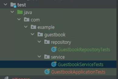 우선 test 폴더에 service 패키지를 추가하고 GuestbookServiceTests.java를 생성한 뒤 아래와 같이 작성해 준다.