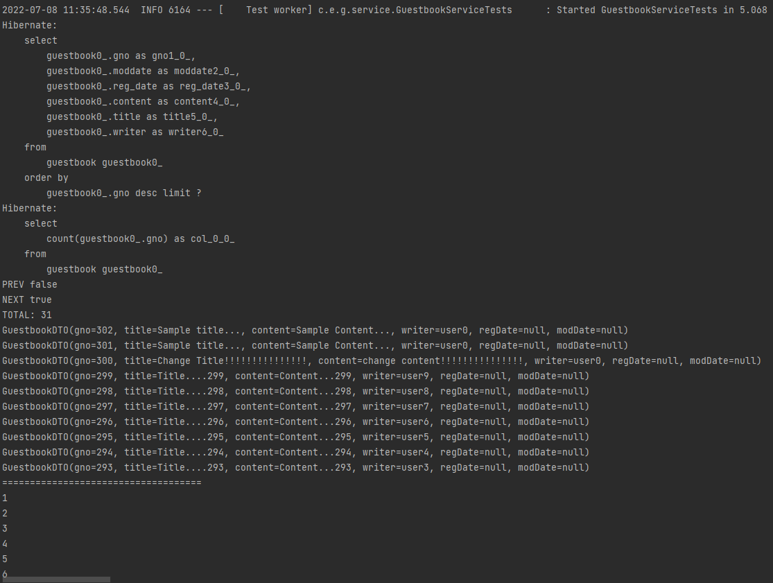 2022-07-08 11:35:48.544 INFO 6164 --- [ Test worker] c.e.g.service.GuestbookServiceTests : Started GuestbookServiceTests in 5.068 seconds (JVM running for 6.892)