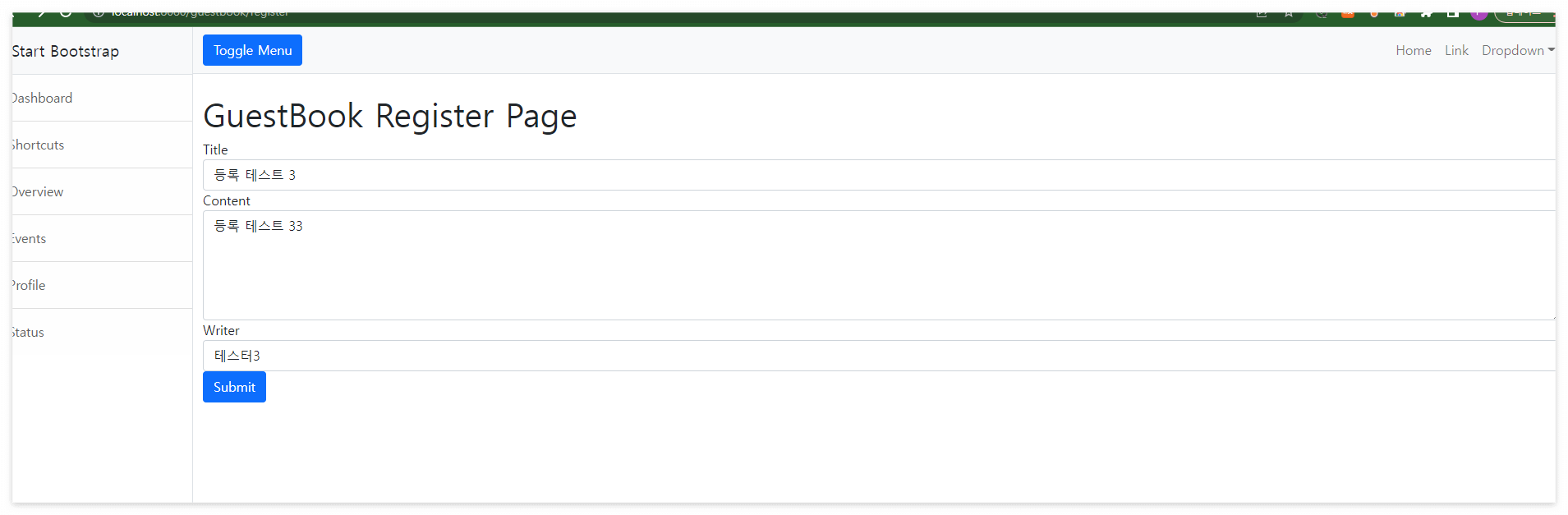 input 태그에는 적절한 name 값을 지정해야 하는데 GuestbookDTO로 수집될 테이터이므로 동일하게 맞춰주면 자동 수집된다.