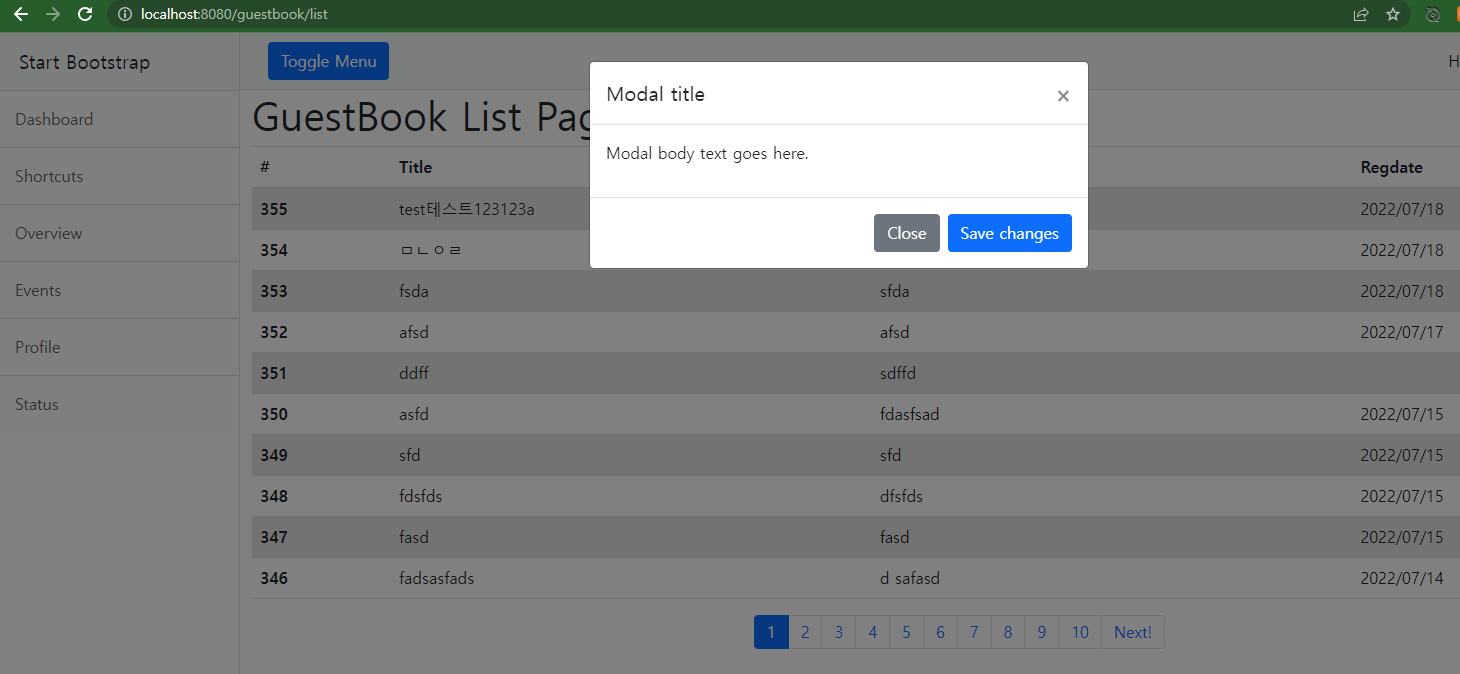 프로젝트를 재실행 한 뒤 등록 테스트를 해 본다. 모달이 제대로 뜨는 것을 확인하기 위함이다.