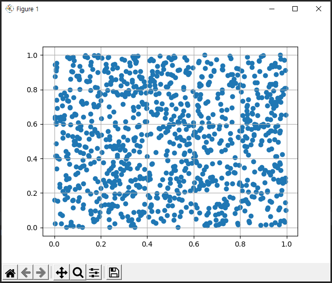 아래 코드는 다수의 균일한 확률의 난수를 x좌표, y좌표로 삼는다.