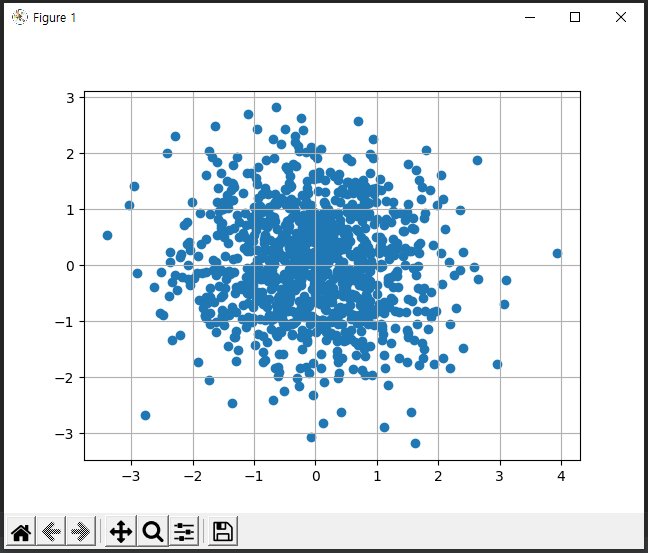 아래의 코드는 정규분포를 따르는 난수를 x 좌표, y 좌표로 한다.