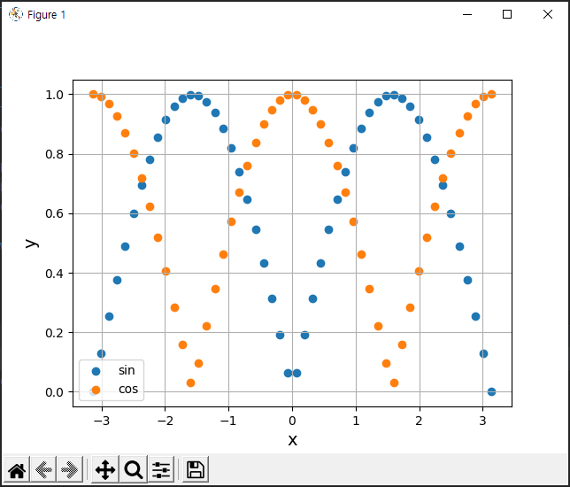 sin() 함수와 cos()함수의 절댓값을 그래프로 표시한다.