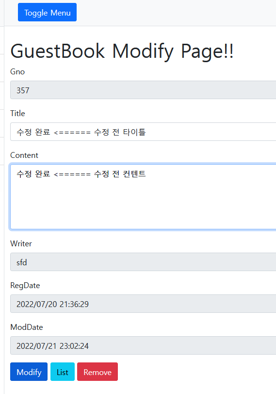 - 현재 modify.html에는 '/guestbook/read'로 이동할 때 페이지 번호(page)가 파라미터로 전달된다.