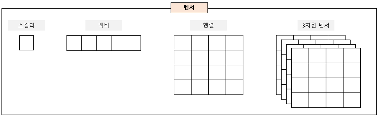 - 텐서는 스칼라, 벡터, 행렬을 포함한다.