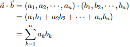 | $\begin{align} \vec{a}\cdot\vec{b} &= (a_{1}, a_{2}, \cdots , a_{n})\cdot(b_{1}, b_{2}, \cdots , b_{n})\\ &=(a_{1}b_{1} + a_{2}b_{2} + \cdots + a_{n}b_{n})\\ &= \sum_{k=1}^n a_{k}b_{k}\\ \end{align}$ |