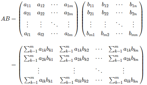 | $ \begin{align} AB &=\begin{pmatrix} a_{11}&a_{12}&\cdots & a_{1m}\\ a_{21}&a_{22}&\cdots & a_{2m}\\ \vdots & \vdots & \ddots & \vdots \\ a_{l1}&a_{l2}&\cdots & a_{lm} \end{pmatrix} \begin{pmatrix} b_{11} & b_{12}&\cdots & b_{1n}\\ b_{21}&b_{22}&\cdots & b_{2n}\\ \vdots & \vdots & \ddots & \vdots \\ b_{m1}&b_{m2}&\cdots & b_{mn} \end{pmatrix}\\ \\ &= \begin{pmatrix} \sum_{k=1}^m a_{1k}b_{k1}&\sum_{k=1}^m a_{1k}b_{k2}&\cdots & \sum_{k=1}^m a_{1k}b_{kn}\\ \sum_{k=1}^m a_{2k}b_{k1}&\sum_{k=1}^m a_{2k}b_{k2}&\cdots & \sum_{k=1}^m a_{2k}b_{kn}\\ \vdots & \vdots & \ddots & \vdots \\ \sum_{k=1}^m a_{lk}b_{k1}&\sum_{k=1}^m a_{lk}b_{k2}&\cdots & \sum_{k=1}^m a_{lk}b_{kn} \end{pmatrix} \end{align}$ | ![]() |