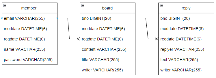 따라서 회원과 게시글의 관계, 게시글과 댓글의 관계는 아래와 같이 표현될 수 있다.