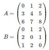 | $ \begin{align} A &=\begin{pmatrix} 0 & 1& 2\\ 3 & 4 & 5 \\ 6 & 7 & 8 \end{pmatrix} \\ B &= \begin{pmatrix} 0 & 1& 2\\ 2 & 0 & 1 \\ 1 & 2 & 0 \end{pmatrix} \end{align}$ |