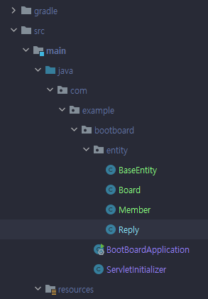 - entity 패키지에 Member(회원), Board(게시물), Reply(댓글) 엔티티 클래스를 추가한다.