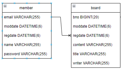 - member 테이블의 email을 board에서 FK로 참조하는 구조이다.