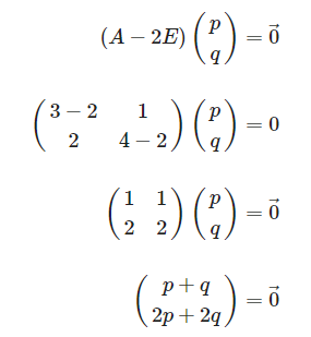 | $\begin{align} (A-2E) \begin{pmatrix}p \\ q \end{pmatrix} &= \vec{0} \\ \\ \begin{pmatrix} 3-2 & 1 \\ 2 & 4-2 \end{pmatrix} \begin{pmatrix}p \\ q \end{pmatrix} &= 0 \\ \\ \begin{pmatrix}1 & 1 \\ 2 & 2 \end{pmatrix}\begin{pmatrix}p \\ q \end{pmatrix}&= \vec{0} \\ \\ \begin{pmatrix}p+q \\ 2p+2q \end{pmatrix} &= \vec{0} \end{align}$ |