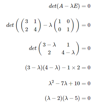 | $\begin{align} det(A-\lambda{E}) &= 0 \\ \\ det\begin{pmatrix} \begin{pmatrix} 3&1 \\ 2&4 \end{pmatrix} -\lambda \begin{pmatrix} 1&0 \\ 0&1 \end{pmatrix} \end{pmatrix} &= 0 \\ \\ det\begin{pmatrix} 3-\lambda & 1 \\ 2 & 4-\lambda \end{pmatrix} &= 0\\ \\ (3-\lambda)(4-\lambda) -1\times{2} &= 0\\ \\ \lambda^{2} -7\lambda + 10 &= 0 \\ \\ (\lambda - 2)(\lambda - 5) &= 0 \end{align}$ |
