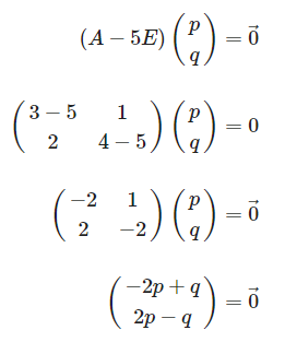 | $\begin{align} (A-5E) \begin{pmatrix}p \\ q \end{pmatrix} &= \vec{0} \\ \\ \begin{pmatrix} 3-5 & 1 \\ 2 & 4-5 \end{pmatrix} \begin{pmatrix}p \\ q \end{pmatrix} &= 0 \\ \\ \begin{pmatrix}-2 & 1 \\ 2 & -2 \end{pmatrix}\begin{pmatrix}p \\ q \end{pmatrix}&= \vec{0} \\ \\ \begin{pmatrix} -2p+q \\ 2p-q \end{pmatrix} &= \vec{0} \end{align}$ |