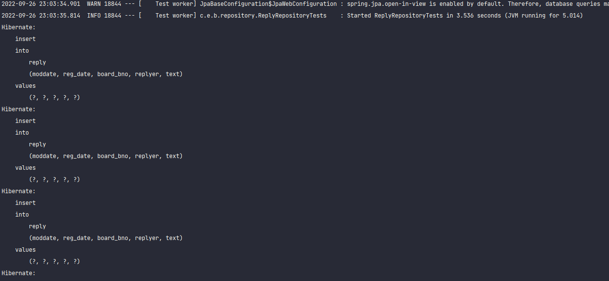 - MemberRepositoryTests, BoardRepositoryTests, ReplyRepositoryTests