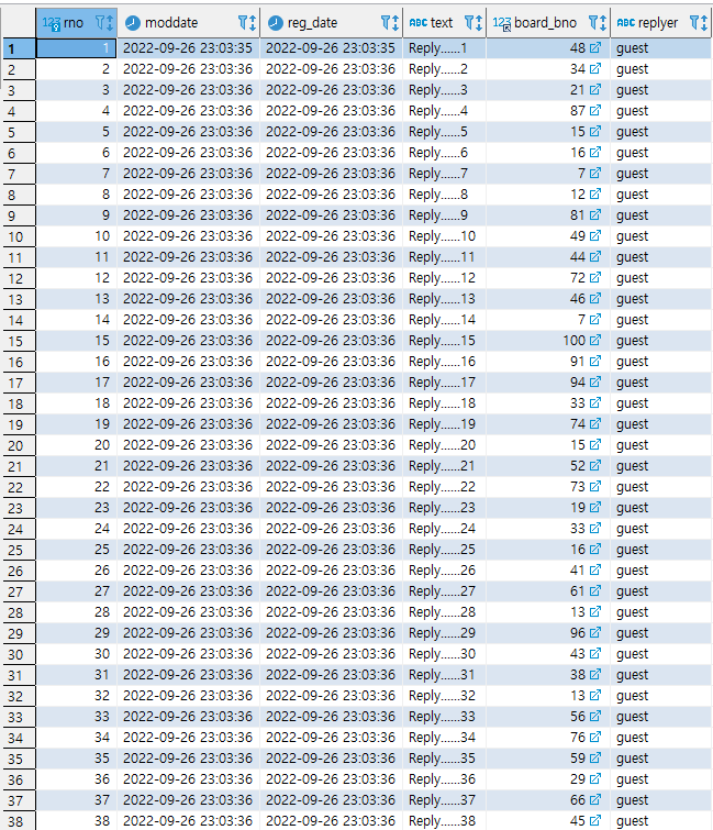 댓글은 ReplyRepositoryTests 클래스를 작성해서 특정한 임의의 게시글을 대상으로 댓글을 추가한다.
