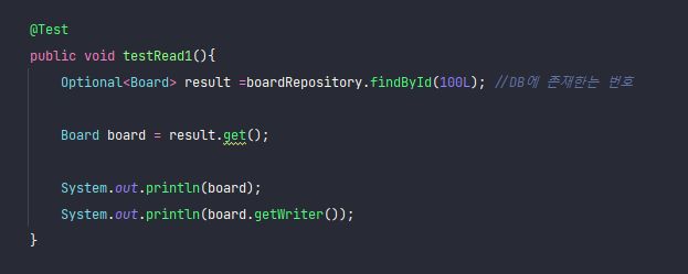 설정을 완료했으면 BoardRepositoryTests.java의 testRead1() 을 실행한다.