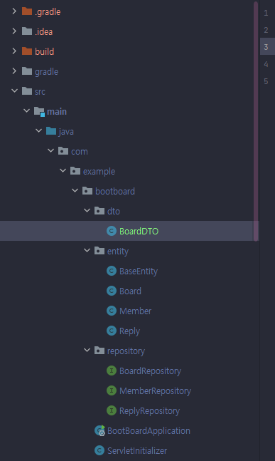 BoardDTO의 경우 Member에 대한 참조는 구성하지 않고 작성한다. DTO는 화면에 전달하는 데이터이거나 그 반대쪽으로 전달되는 데이터를 기준으로 하기 때문에 엔티티 클래스의 구성과 일치하지 않는 경우가 많다.