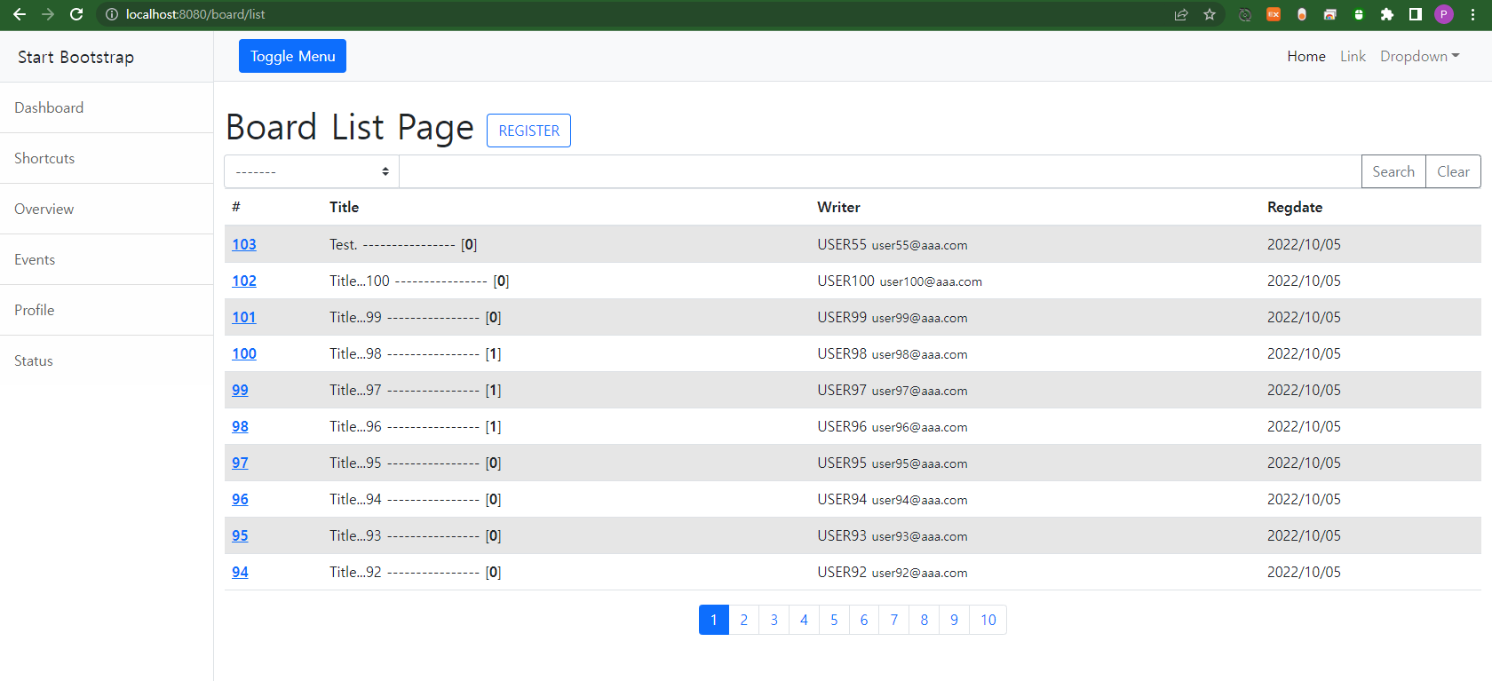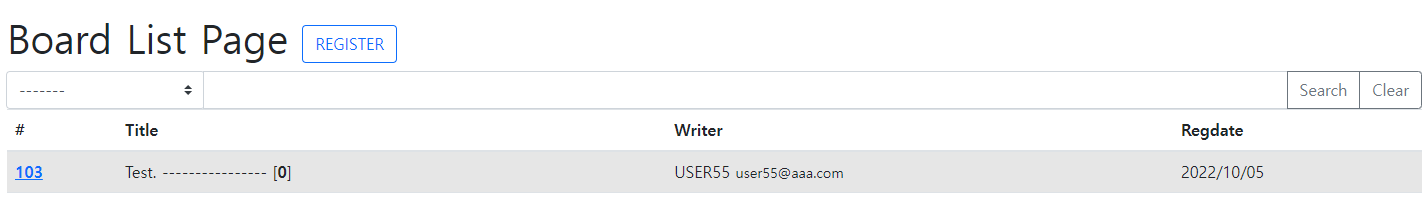 2022-10-12 22:39:19.731 INFO 1696 --- [nio-8080-exec-4] c.e.b.r.s.SearchBoardRepositoryImpl : [[Board(bno=102, title=Title...100, content=Content...100), Member(email=user100@aaa.com, password=11111, name=USER100), 0], [Board(bno=93, title=Title...91, content=Content...91), Member(email=user91@aaa.com, password=11111, name=USER91), 0], [Board(bno=83, title=Title...81, content=Content...81), Member(email=user81@aaa.com, password=11111, name=USER81), 1], [Board(bno=73, title=Title...71, content=Content...71), Member(email=user71@aaa.com, password=11111, name=USER71), 2], [Board(bno=63, title=Title...61, content=Content...61), Member(email=user61@aaa.com, password=11111, name=USER61), 0], [Board(bno=53, title=Title...51, content=Content...51), Member(email=user51@aaa.com, password=11111, name=USER51), 0], [Board(bno=43, title=Title...41, content=Content...41), Member(email=user41@aaa.com, password=11111, name=USER41), 0], [Board(bno=33, title=Title...31, content=Content...31), Member(email=user31@aaa.com, password=11111, name=USER31), 1], [Board(bno=23, title=Title...21, content=Content...21), Member(email=user21@aaa.com, password=11111, name=USER21), 1], [Board(bno=21, title=Title...19, content=Content...19), Member(email=user19@aaa.com, password=11111, name=USER19), 0]]