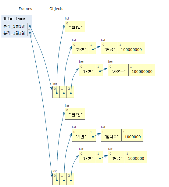 - 이렇게 만든 리스트가 분개장의 개념이 된다. 이 때 튜플이 아닌 리스트로 생성해야 한다.