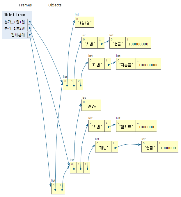 - [일자], [차변 분개 내용], [대변 분개 내용] 을 각 일자별 분개 리스트에 하위 리스트로 넣는다.