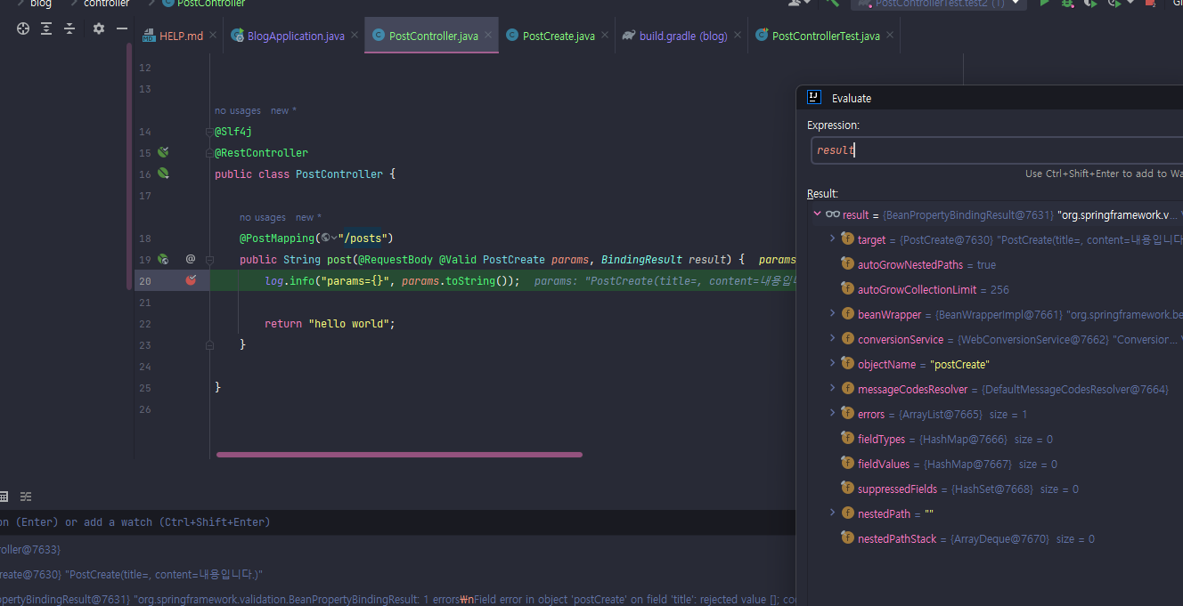 public Map<String, String> post(@RequestBody @Valid PostCreate params, BindingResult result) {