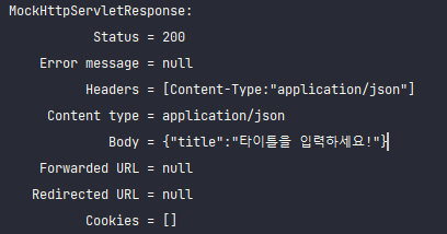 MockHttpServletResponse: Status = 200 Error message = null Headers = [Content-Type:"application/json"] Content type = application/json Body = {"title":"must not be blank"} Forwarded URL = null Redirected URL = null Cookies = []
