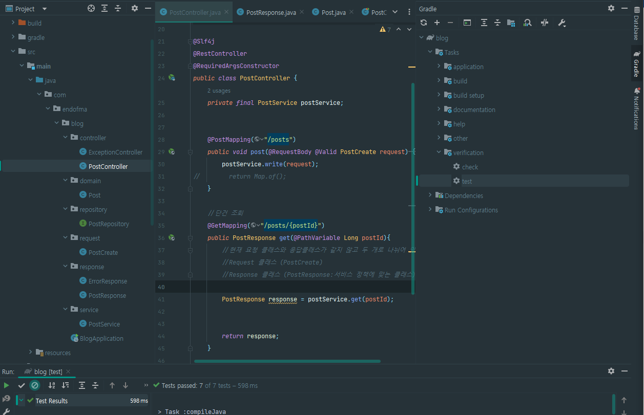 - PostController => PostService => PostResponse => PostControllerTest => 결과