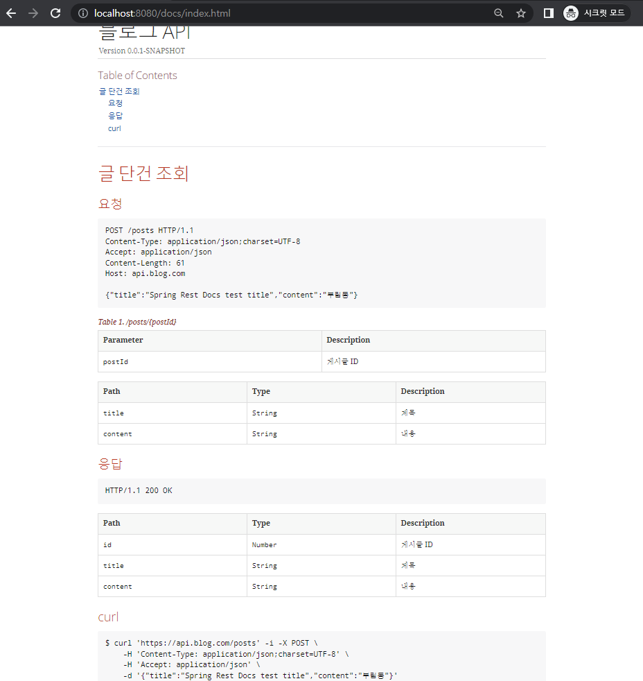 글 등록 테스트 및 글 등록 API를 index.adoc에 추가