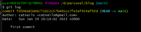 그래도 git log를 쳐보면 바뀌지 않는다. 그 다음 커밋부터 바뀌기 때문이다.