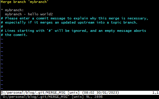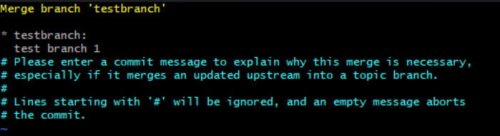아래와 같이 vi로 들어간다. 커밋 메시지를 확인하고 q 또는 wq를 입력하여 나온다.