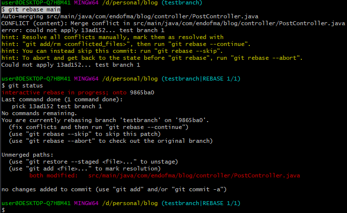이럴 때 testbranch에서 git rebase main을 사용하면 메인의 최신 커밋을 내 분기 밑으로 오도록 만들어 준다.