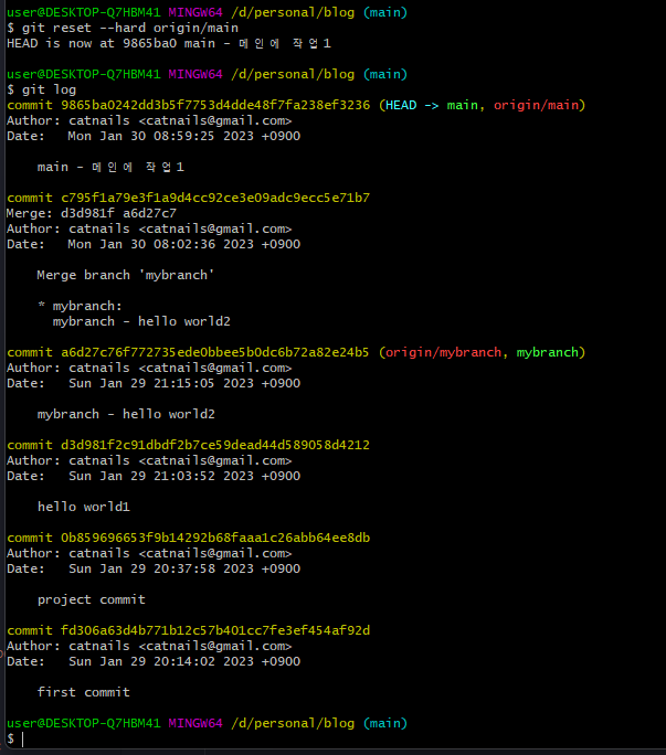 다른 방법을 실습하기 위해 커밋을 되돌린다.