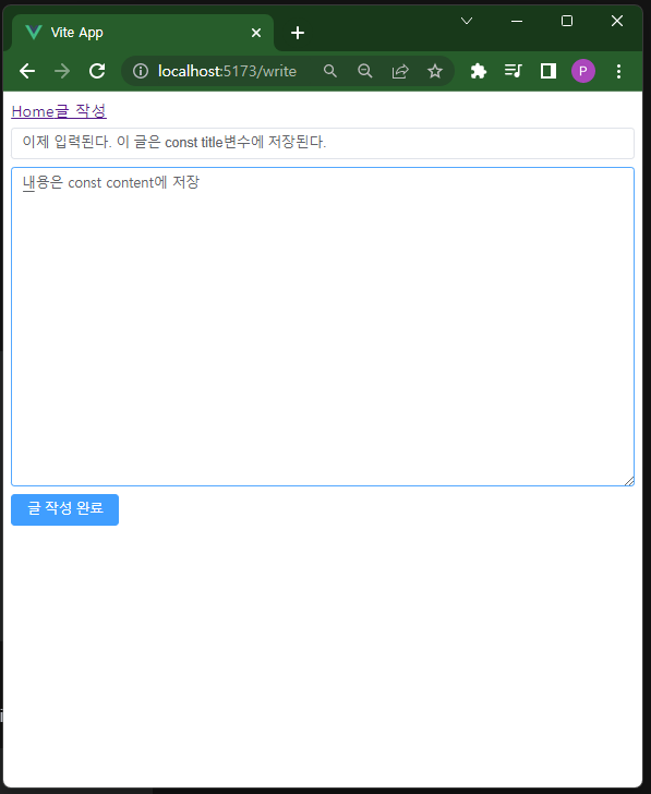 반응형 변수 title과 content를 선언하고 이들을 값을 입력 태그의 v-model 값으로 설정한다.