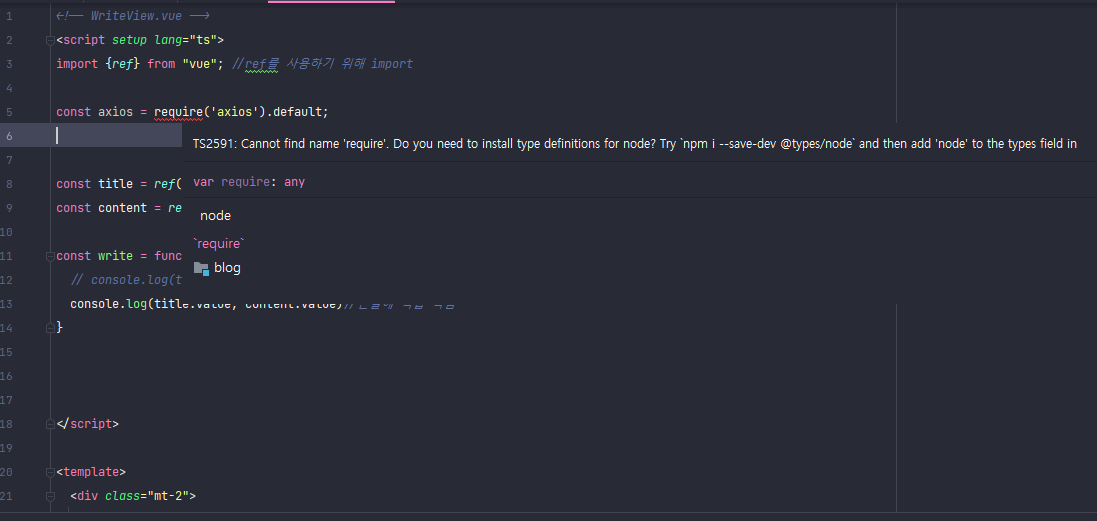 여기까지가 기본적인 내용이었다. 이제 WriteView.vue 파일의 <template></template> 태그 내부의 내용을 모두 지운다.