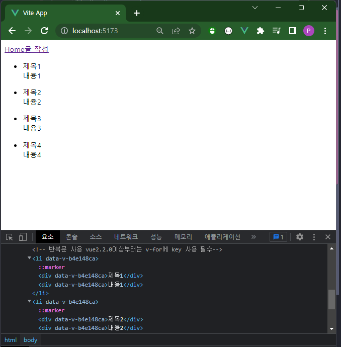 <!-- 반복문 사용 vue2.2.0이상부터는 v-for에 key 사용 필수-->