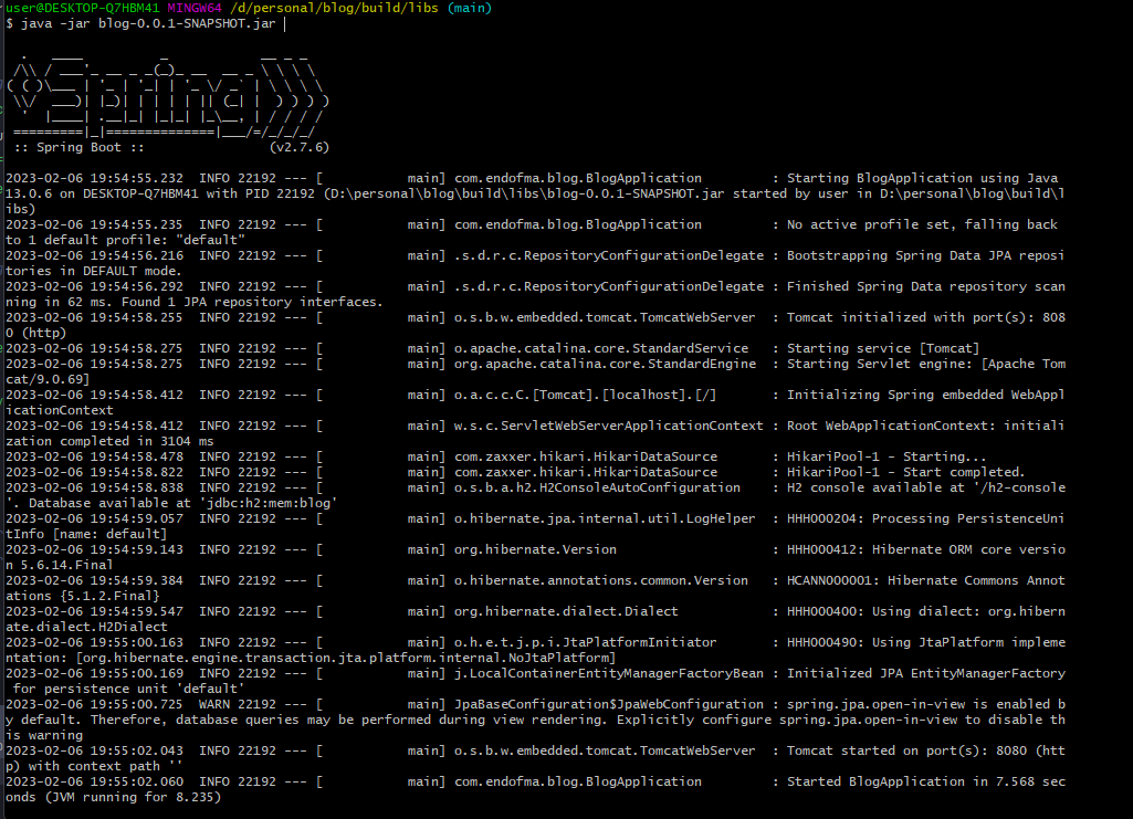 $ java -jar -Dspring.profiles.active=local blog-0.0.1-SNAPSHOT.jar