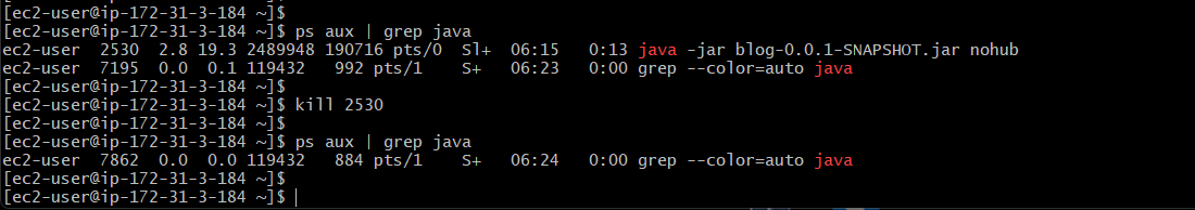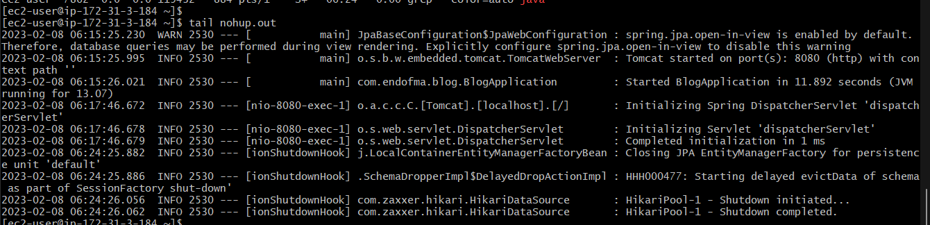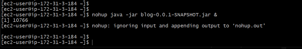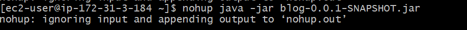 nohup을 붙여서 애플리케이션을 실행하더라도 뭔가 할 수 있는 것은 아니다. 다른 일을 하기 위해서는 프로세스를 백그라운드로 넘겨야 한다. 이 때는 맨 끝에 &(ampersand)만 붙이면 된다