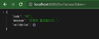 만약 위와 같은 api가 있다면 accessToken 값을 넣어 요청하지 않아도 예외가 발생하지 않는다. "인증이 필요 없는 페이지"라는 문자열을 브라우저 창에서 볼 수 있을 것이다. 해당 api의 파라미터에 UserSession이 없기 때문이다.