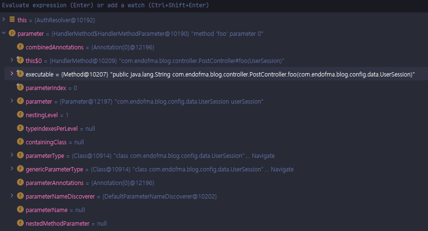 return parameter.getParameterType().equals(UserSession.class); 코드에 Break Point를 걸고