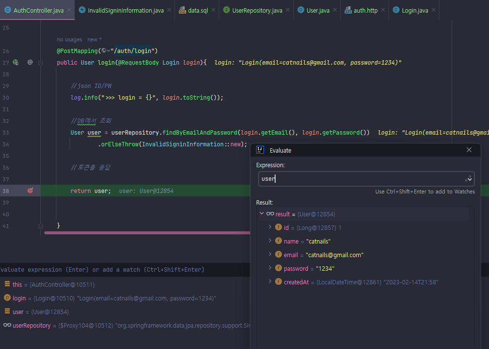 User user = userRepository.findByEmailAndPassword(login.getEmail(), login.getPassword())