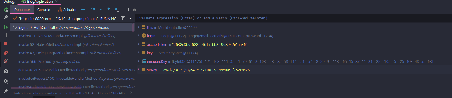 // Key key = Keys.secretKeyFor(SignatureAlgorithm.HS256); 이렇게 하면 요청이 올 때마다 key 값이 다르게 저장된다. 따라서 일반적으로는 고정하여 사용한다.