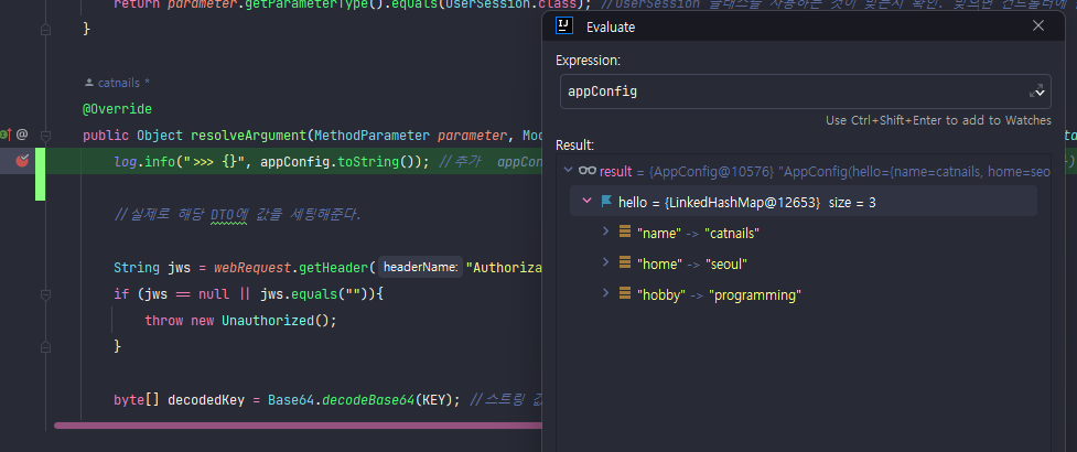 값이 들어온 것을 확인할 수 있다. 이렇면 String hello = appConfig.hello; 처럼 값을 사용할 수 있게 된다.